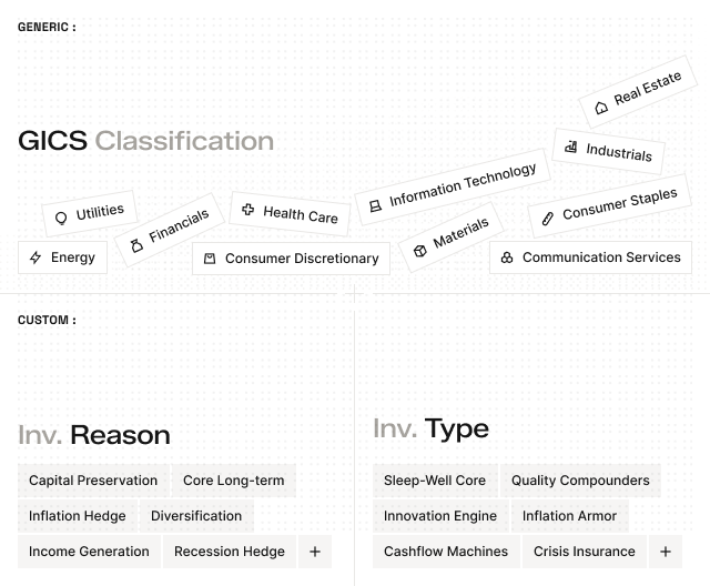 Classify holdings beyond the obvious—by themes, business models, revenue drivers, or risk attributes. Get a deeper map of your portfolio without manual tagging.
